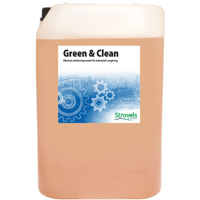 Green & Clean ett alkaliskt rengöringsmedel baserat på naturliga sockertensider för industriell rengöring i tvättanläggningar eller bad med arbetstemperaturer upp till +80°C. Innehåller inga petroleumdestillat, lösningsmedel eller stark alkali.
