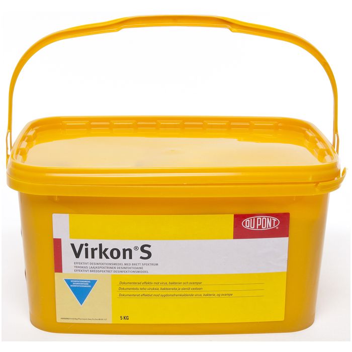 Virkon S användes inom human- och djursjukvård i djurstallar, växthus, kläckerier, potatislager, transportfordon, minkfarmer, fiskodlingar, lagerrum för grönsaker m.m. Användes även till föremål i anslutning till ovanstående t.ex. stöveldesinfektion och desinfektion av instrument. Medlet har ett brett verkningsspektrum. Virkon S är ett patenterat biologiskt nedbrytbart desinfektionsmedel. Desinfektionen ska föregås av rengöring för optimalt desinfektionsresultat. pH i 1%-ig lösning är ca 2,6. Virkon S är ett oxiderande medel med kaliumperoximonosulfat som aktiv substans.