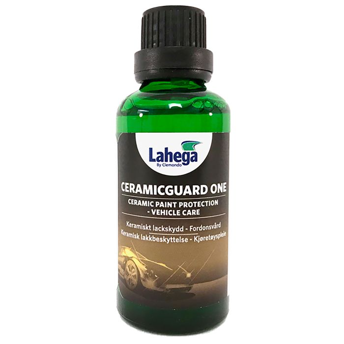 Ceramicguard One är ett 1-komponents keramiskt lackskydd som ger utmärkt glans och vattenavstötning med en hållbarhet på 18 månader med möjlighet till förlängning till 24 månader om behandlingen läggs i två steg. Dessutom skyddar den hårda ytan mot virvlande partiklar i trafiken och det bildas färre smårepor i lacken. Skyddar också billacken mot den nedbrytning och glansminskning som orsakas av solens UV-strålar, surt regn, luftföroreningar, trafiksmuts, vägsalt och andra kemikalier. Behandlingen fyller ut de ojämnheter som normalt förekommer i billacken och tillsammans med den vattenavstötning som skyddet ger håller sig bilen ren längre och behöver inte tvättas lika ofta. Ceramicguard One kan även användas till fälgar, plastdetaljer och polerade strålkastare. En bil som är behandlad med Ceramicguard One kommer att ha ytor i mycket bättre kondition och en snygg och fräsch bil är mer attraktiv och har ett högre andrahandsvärde. En behandling är med andra ord en skyddande investering. Innehåller 50 ml och räcker till två normalstora bilar.