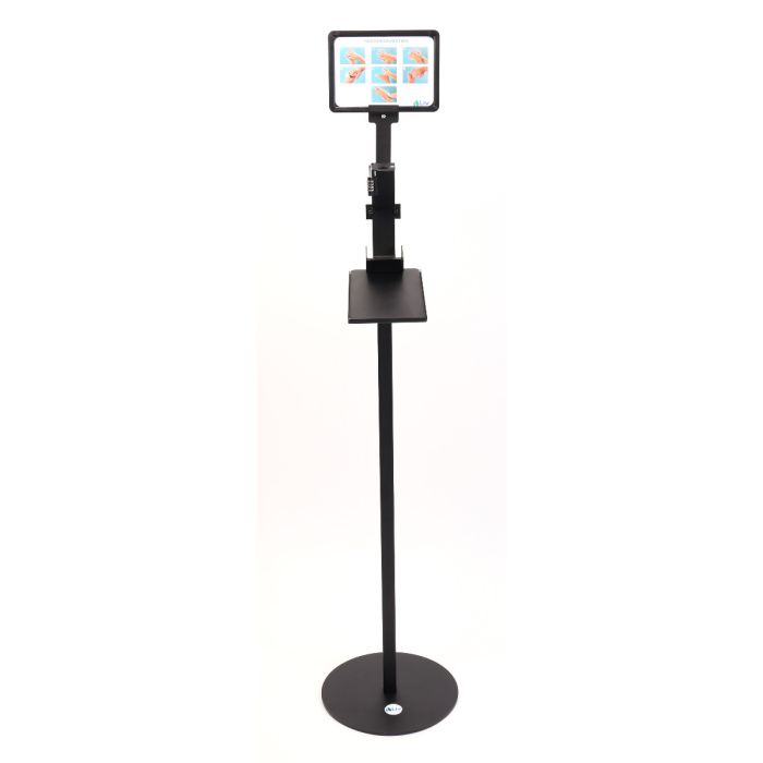 Golvställ med droppbricka och infoskylt avsedd för 600 ml pumpflaska. Hänglås med kod.