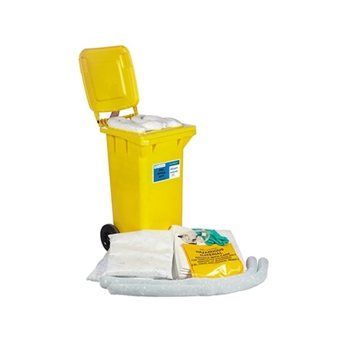 Väl synligt gult spillkit för petroleumbaserade vätskor. Mobiliteten möjliggör enkel driftsättning både inomhus och utomhus.