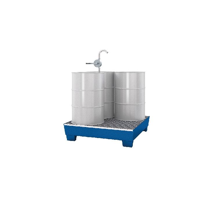Extra kompakt, utrymmessnålt utförande. Svetsad stålkonstruktion – säker och lång livslängd. Godkänd för lagring av brandfarliga vätskor (H224-226) och miljöfarliga kemikalier. Med nationell försäkran om överensstämmelse enligt gällande bestämmelser. Täthetskontroll med kontrollintyg. Korrosionsskydd genom högkvalitativ lackering i gentianablått (RAL 5010). Med optimerad fotkonstruktion för intern transport. Uttagbart, varmförzinkat galler som avställningsyta.