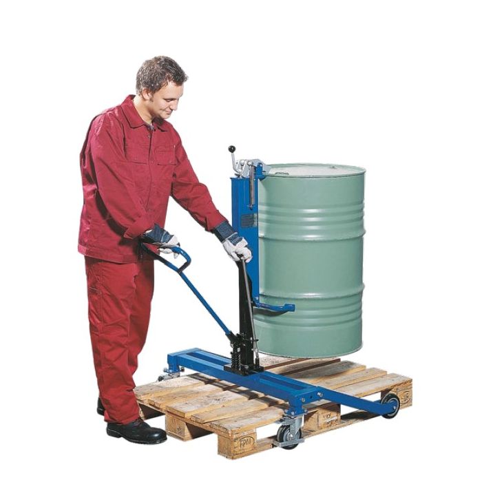 För 200 liters stålfat med krage.Justerbar hjulbas (720 mm upp till 1390 mm ingångsbredd).Lätt att manövrera i trånga utrymmen.Självstängande gripmekanism.