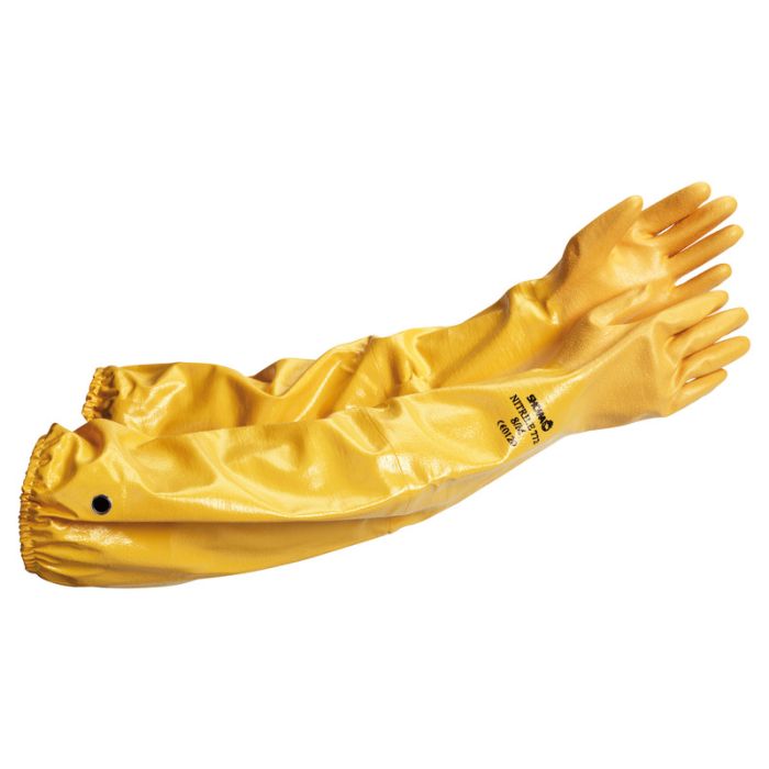 Extra lång nitrildoppad kemskyddshandske. Perfekt vid mycket blöta eller oljiga arbeten och när det finns risk att man doppar även armen. En elastisk kant håller 772 på plats, och dess antibakteriella och luktfria egenskaper är idealiska vid långvarigt användande. Lämplig för packning av kemiska substanser, borrnings- och blästrings- arbeten, fiske, offshore.