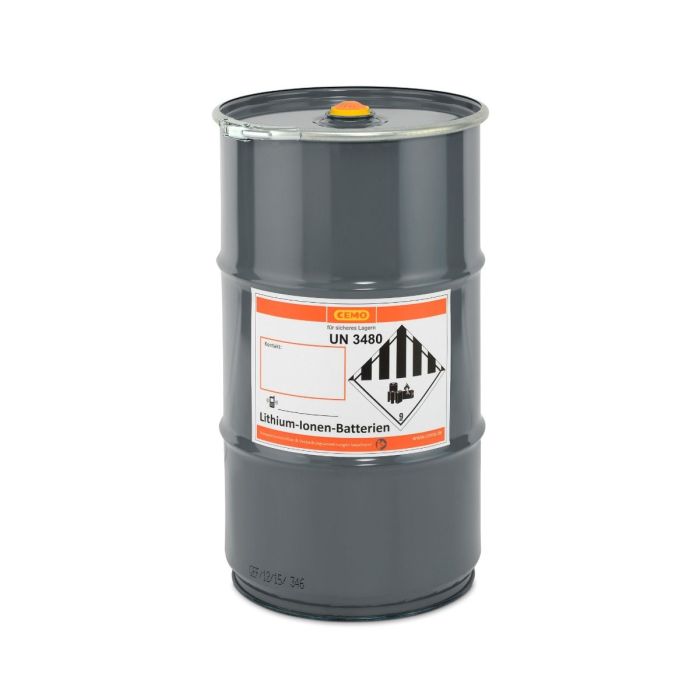Säkerhetstunna avsedd för batterier. 60 L med spännringslock. Speciell ventil för tryckutjämning vid eventuell skada.