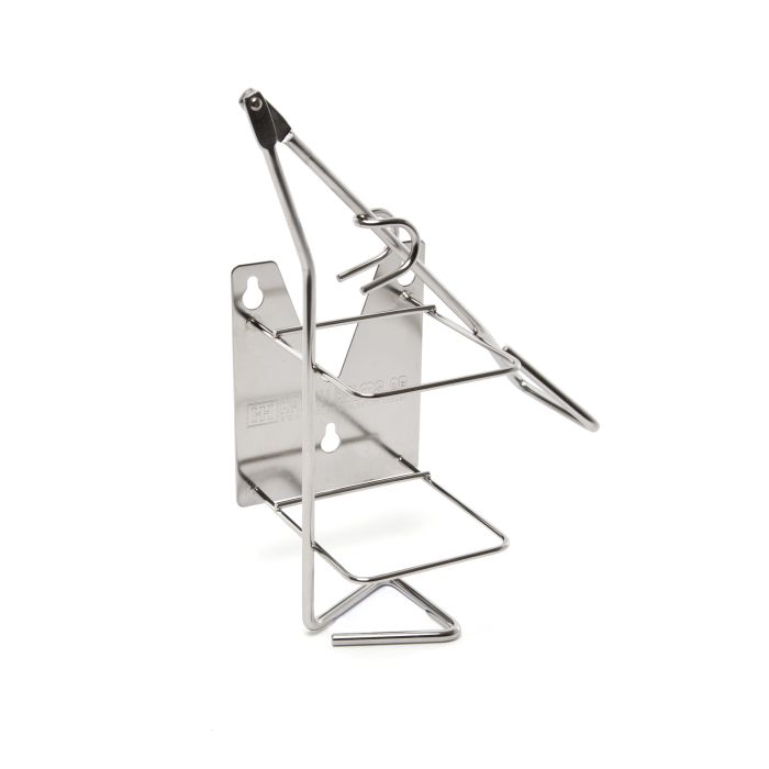 Rostfri armmanövrerad dispenserhållare avsedd för 600 ml flaskor. Vriden höger.