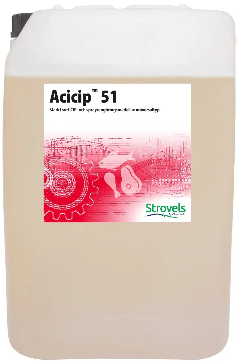 Acicip 51 är ett extra kraftfullt surt diskmedel för livsmedelsindustrin och motsvarande områden. Utmärkt för CIP-diskning och avkalkning av t.ex skänkvagnar, plast- och stålbackar Fungerar bra att använda både i diskmaskin och i kar.