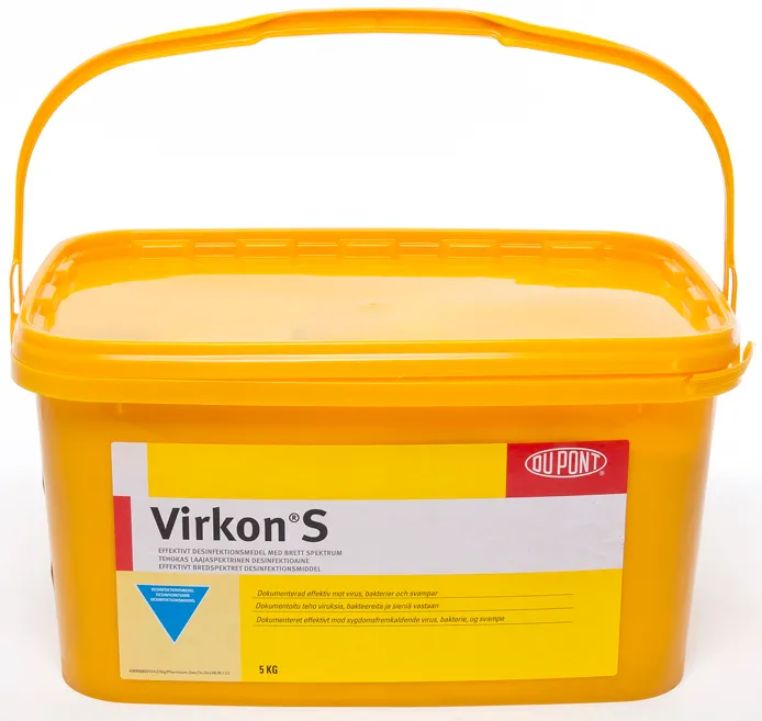 Virkon S användes inom human- och djursjukvård i djurstallar, växthus, kläckerier, potatislager, transportfordon, minkfarmer, fiskodlingar, lagerrum för grönsaker m.m. Användes även till föremål i anslutning till ovanstående t.ex. stöveldesinfektion och desinfektion av instrument. Medlet har ett brett verkningsspektrum. Virkon S är ett patenterat biologiskt nedbrytbart desinfektionsmedel. Desinfektionen ska föregås av rengöring för optimalt desinfektionsresultat. pH i 1%-ig lösning är ca 2,6. Virkon S är ett oxiderande medel med kaliumperoximonosulfat som aktiv substans.