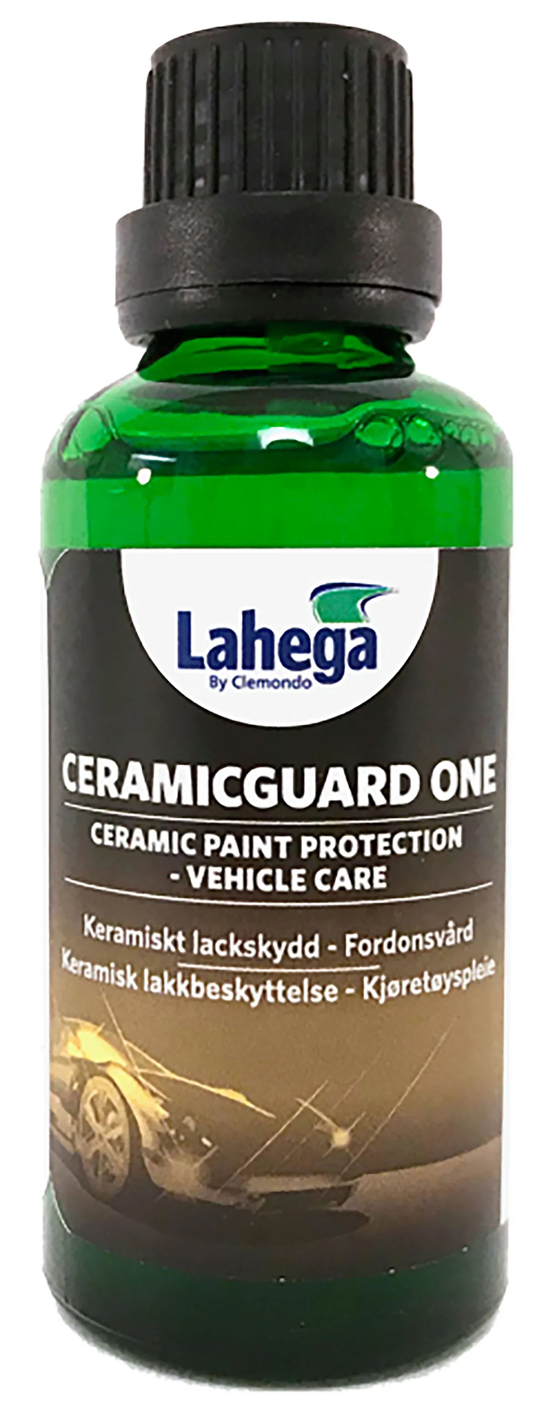 Ceramicguard One är ett 1-komponents keramiskt lackskydd som ger utmärkt glans och vattenavstötning med en hållbarhet på 18 månader med möjlighet till förlängning till 24 månader om behandlingen läggs i två steg. Dessutom skyddar den hårda ytan mot virvlande partiklar i trafiken och det bildas färre smårepor i lacken. Skyddar också billacken mot den nedbrytning och glansminskning som orsakas av solens UV-strålar, surt regn, luftföroreningar, trafiksmuts, vägsalt och andra kemikalier. Behandlingen fyller ut de ojämnheter som normalt förekommer i billacken och tillsammans med den vattenavstötning som skyddet ger håller sig bilen ren längre och behöver inte tvättas lika ofta. Ceramicguard One kan även användas till fälgar, plastdetaljer och polerade strålkastare. En bil som är behandlad med Ceramicguard One kommer att ha ytor i mycket bättre kondition och en snygg och fräsch bil är mer attraktiv och har ett högre andrahandsvärde. En behandling är med andra ord en skyddande investering. Innehåller 50 ml och räcker till två normalstora bilar.